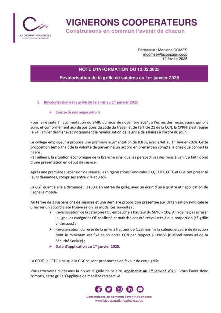 NOTE SOCIALE N° 2025 -2 REVALORISATION GRILLE DES MINIMA JANV. 2025